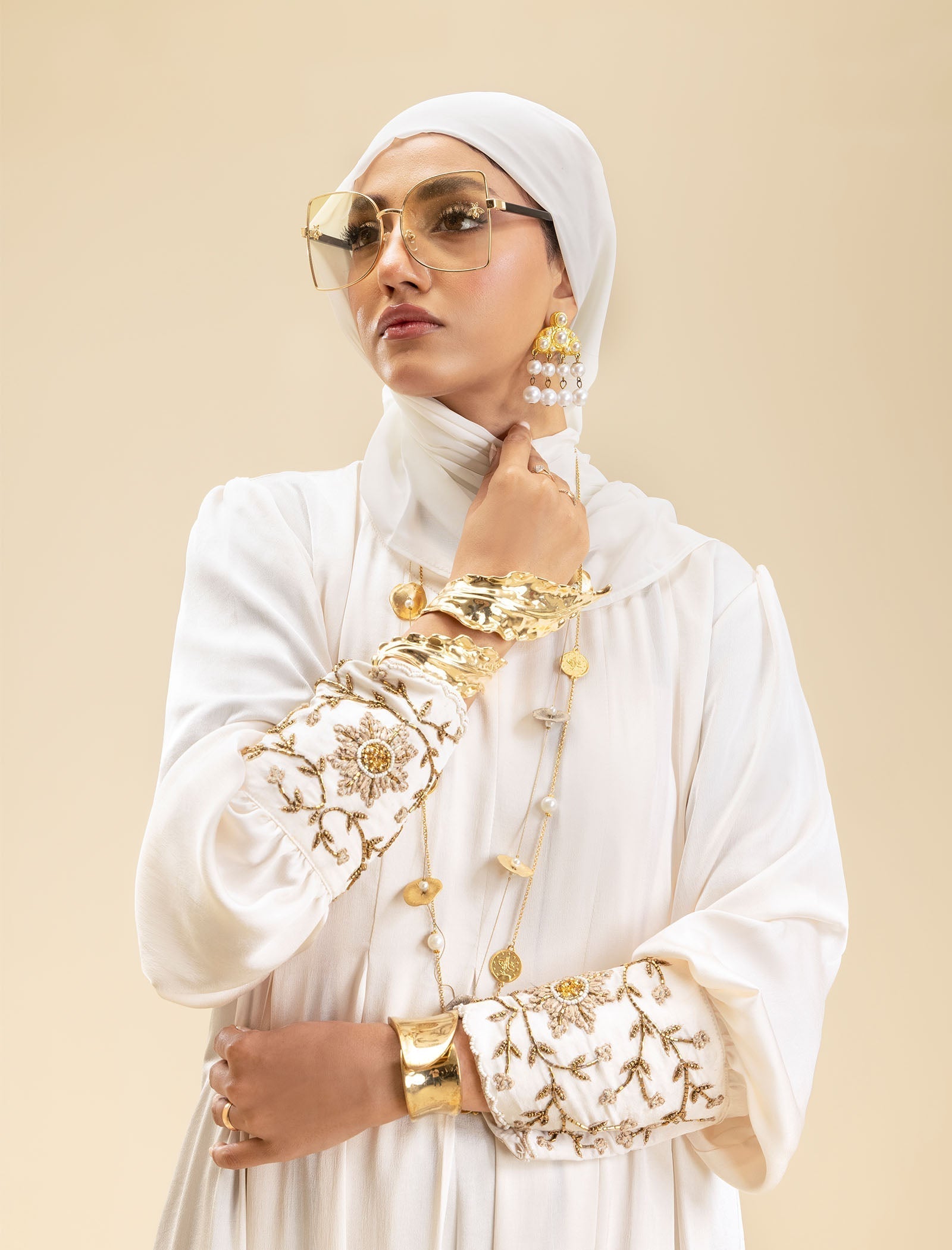 The Pure Pearl abaya is crafted from luxury silk, offering a smooth, sophisticated finish. The cream-colored fabric exudes elegance, while the exclusive handwork on the cuffs adds a refined touch, making this abaya a true style statement.